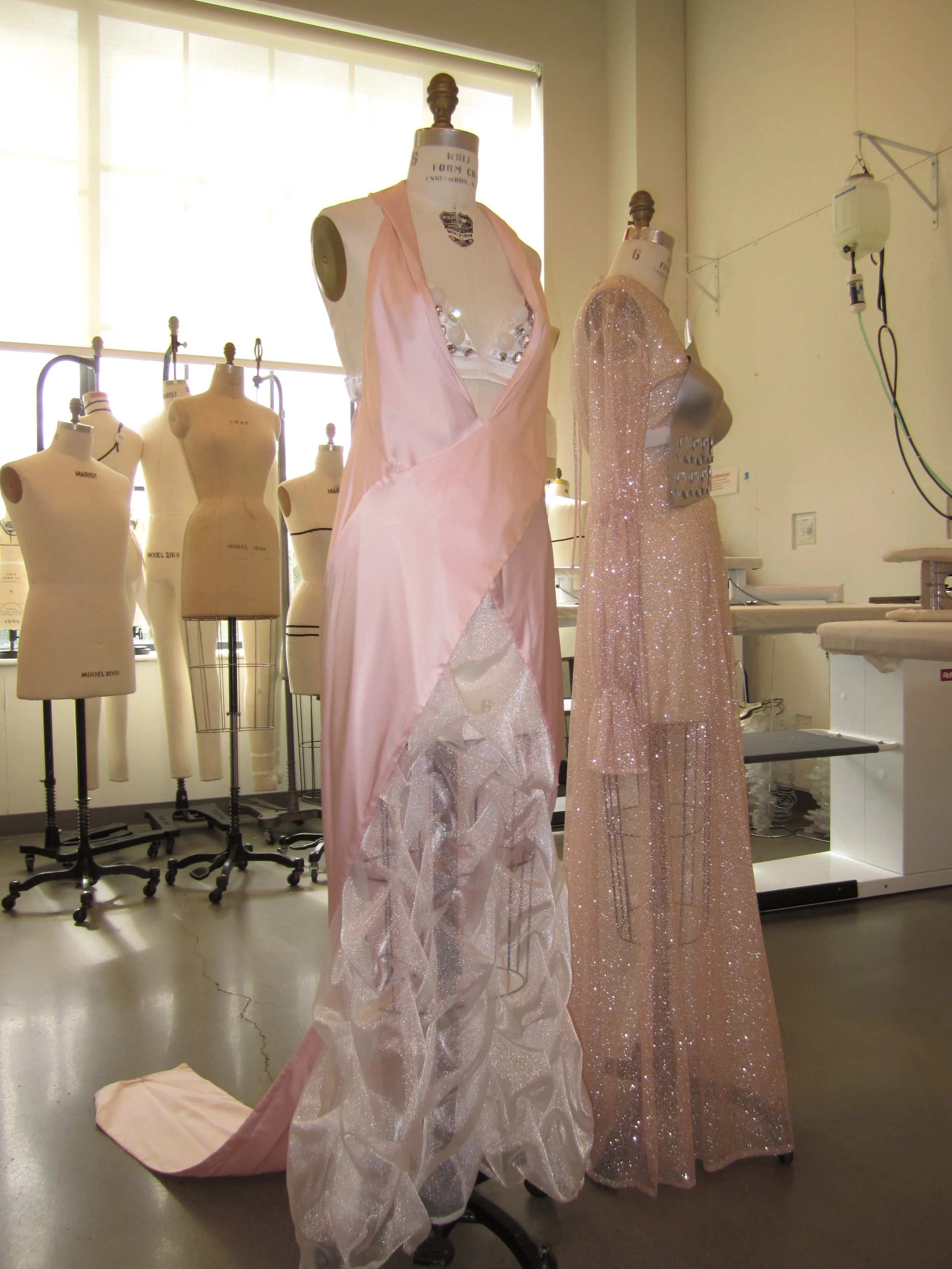 Look number one (left mannequin) features a hand-smocked organza silk skirt paired with a bralette embellished with pearls, rhinestones, and hand-made molded silicone beads. “Silicone is important because women who have mastectomies get silicone implants. It’s an option for them to be more confident in themselves. I decided to make a really gorgeous bra and include the silicon beads just as a resemblance of the beauty of their new form and body.” To complete the look, Brielle added a light pink shawl, elegantly draped into a crisscrossed train, subtly symbolizing the breast cancer ribbon.